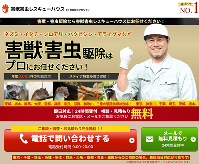害獣害虫レスキューハウスは、関東・近畿・中国・四国・九州エリアまで幅広く対応している害獣専門業者で、各地域にスタッフが待機しているため最短20分で駆けつけてくれます。